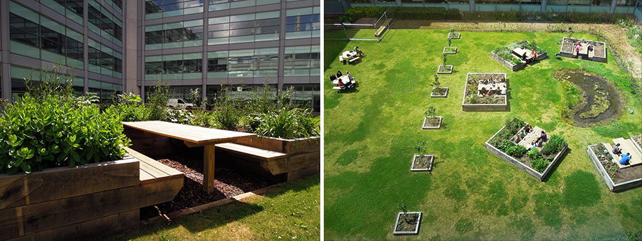 The quad at the Michael Smith Building at Manchester University’s Faculty of Life Sciences was transformed into a place to sit, eat, chat, think, work – an inspiring environment to promote fresh ideas with edible beds, bee friendly planting, native hedging and a pond.