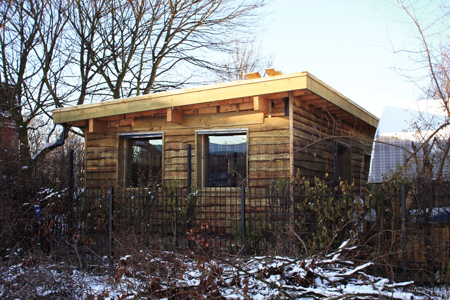 Ready to house the Manchester University Botanical Moss and Fern collection – this shelter is designed to provide a green wall and roof habitat, potting bench and tool storage – as well as shelter from wet weather for staff and students at the Faculty of Life Sciences, University of Manchester.